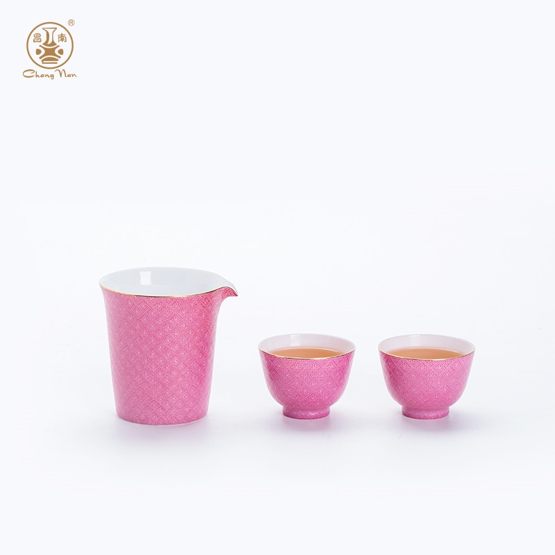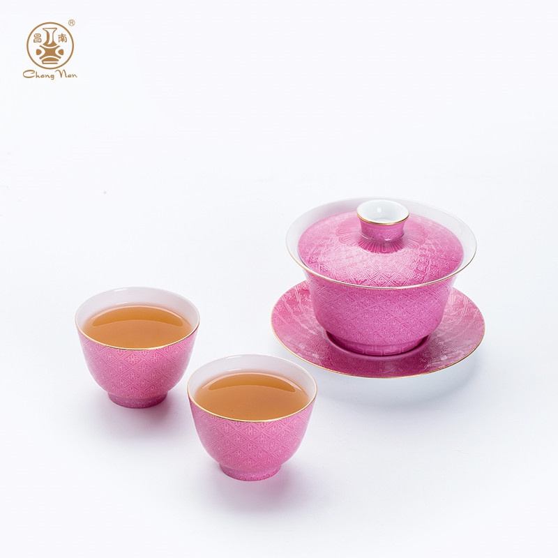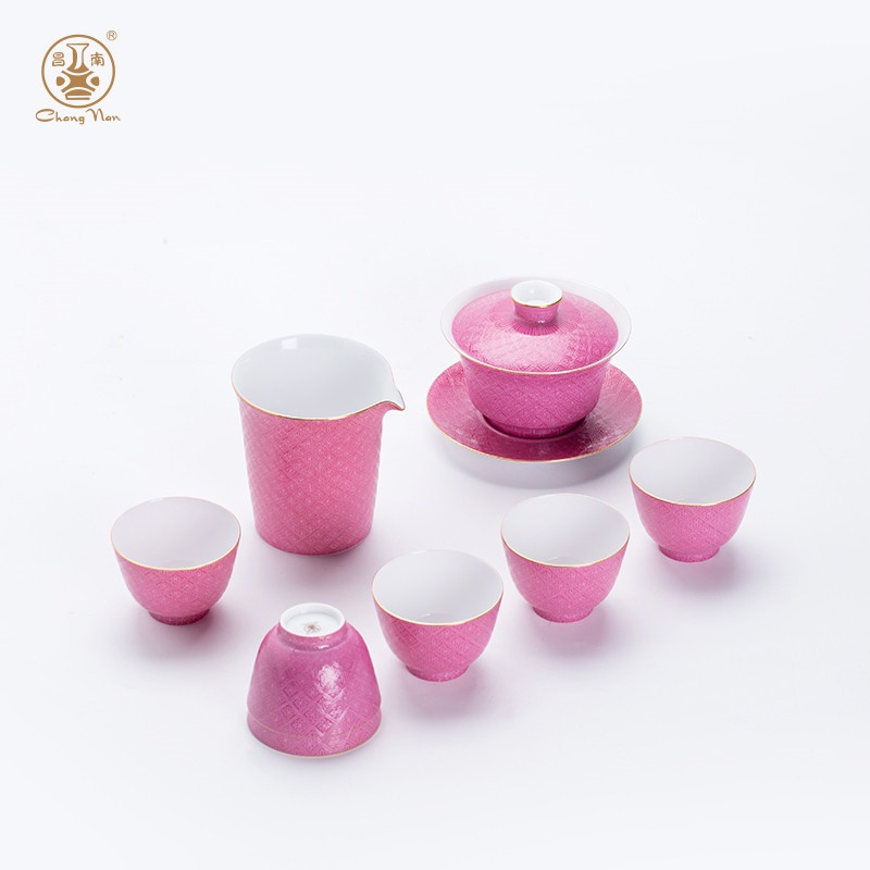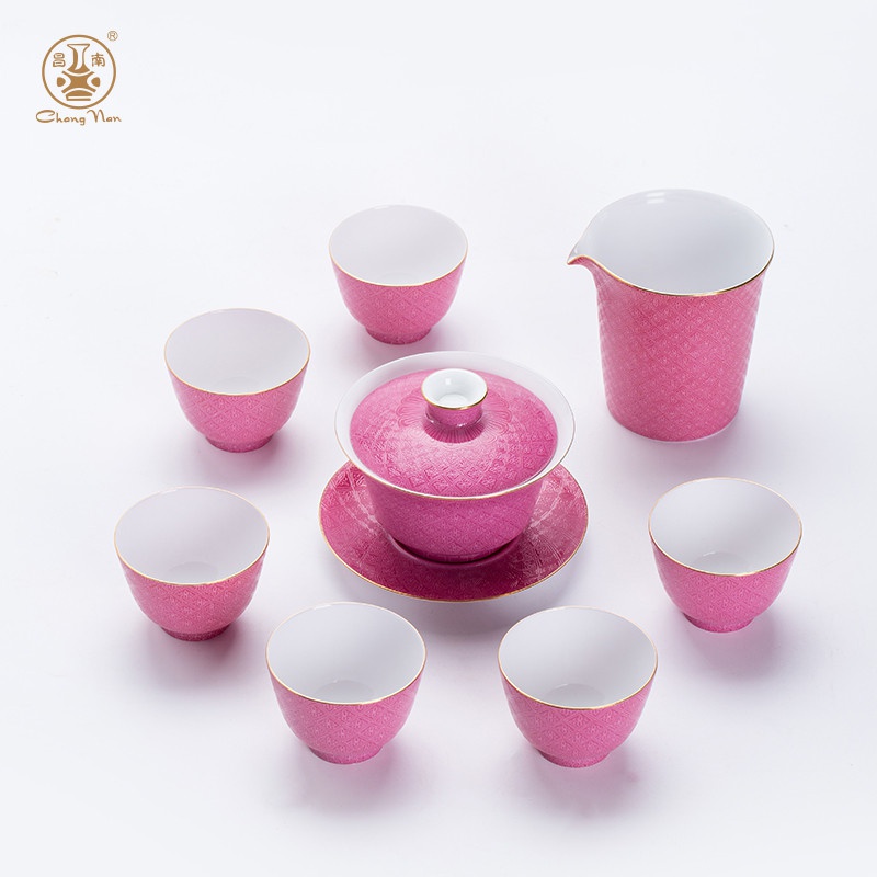 粉彩扒花格桑花系列胭脂紅8頭蓋碗套裝